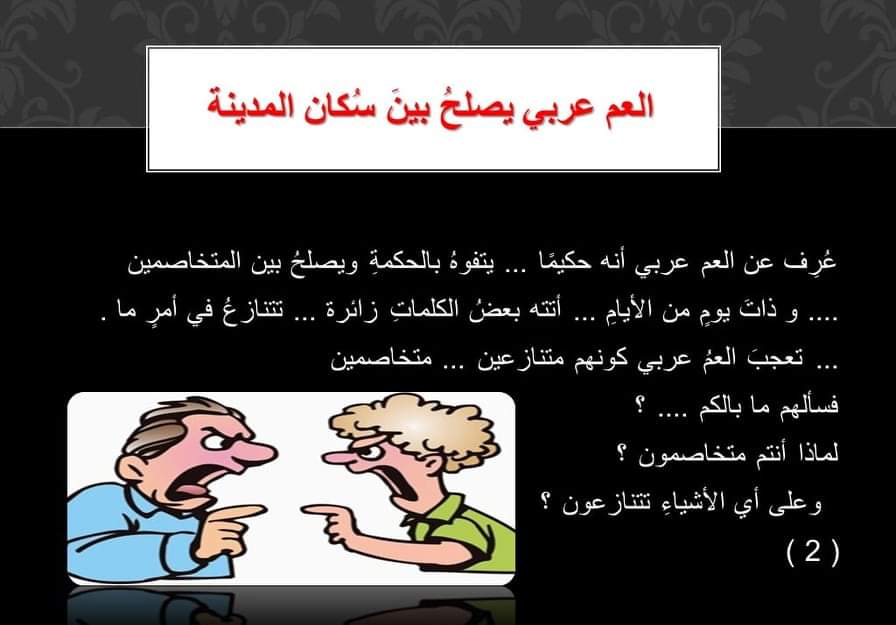 عُرِف عن العم عربي أنه حكيم، يتفوه بالحكمة ويصلح بين المتخاصمين.