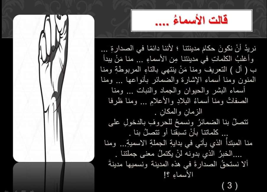 قالت الأسماء: نريد أن نكون حكام مدينتنا؛ لأننا دائما في الصدارة، وأغلب الكلمات في مدينتنا من الأسماء، مِنا مَنْ يبدأ ب ( أل ) التعريف، ومِنا منْ ينتهي بالتاء المربوطة ومِنا المنون ومنا أسماء الإشارة والضمائر بأنواعها، ومِنا أسماء البشر والحيوان والجماد والنبات، ومنا الصفات ومنا أسماء البلاد والأعلام، ومِنا ظرفا الزمان والمكان.