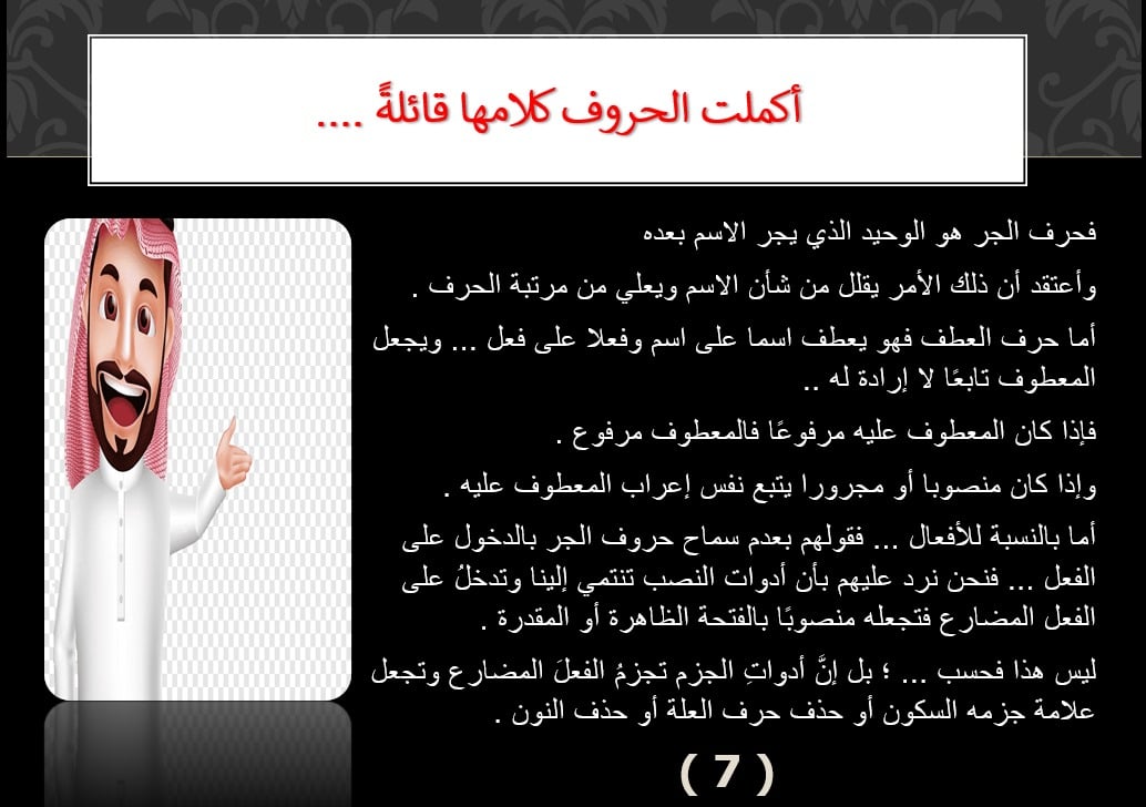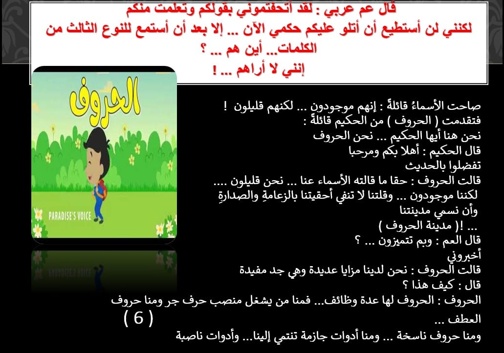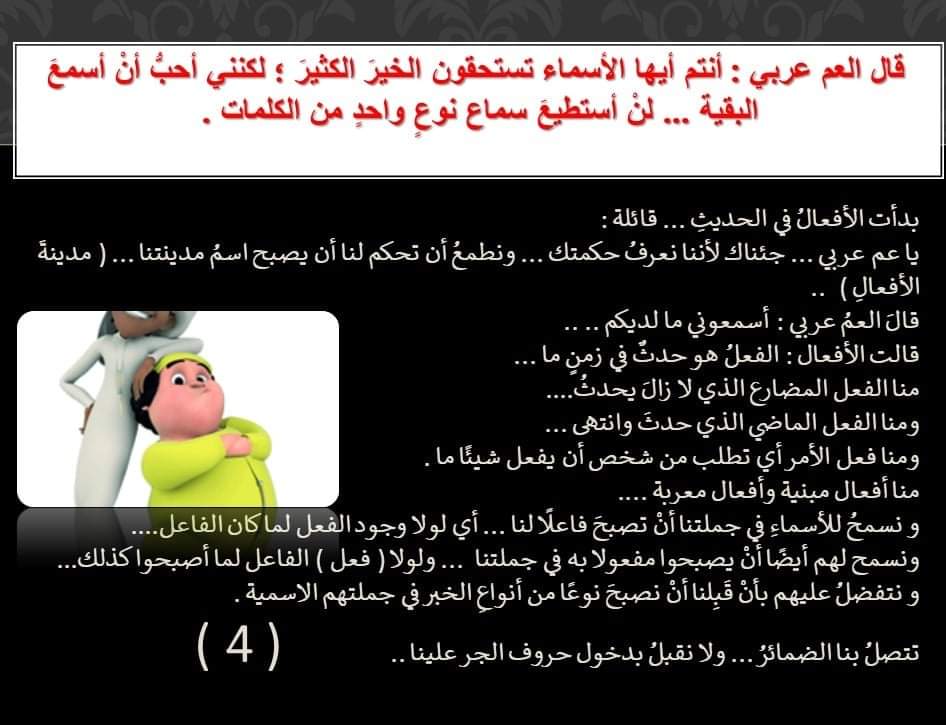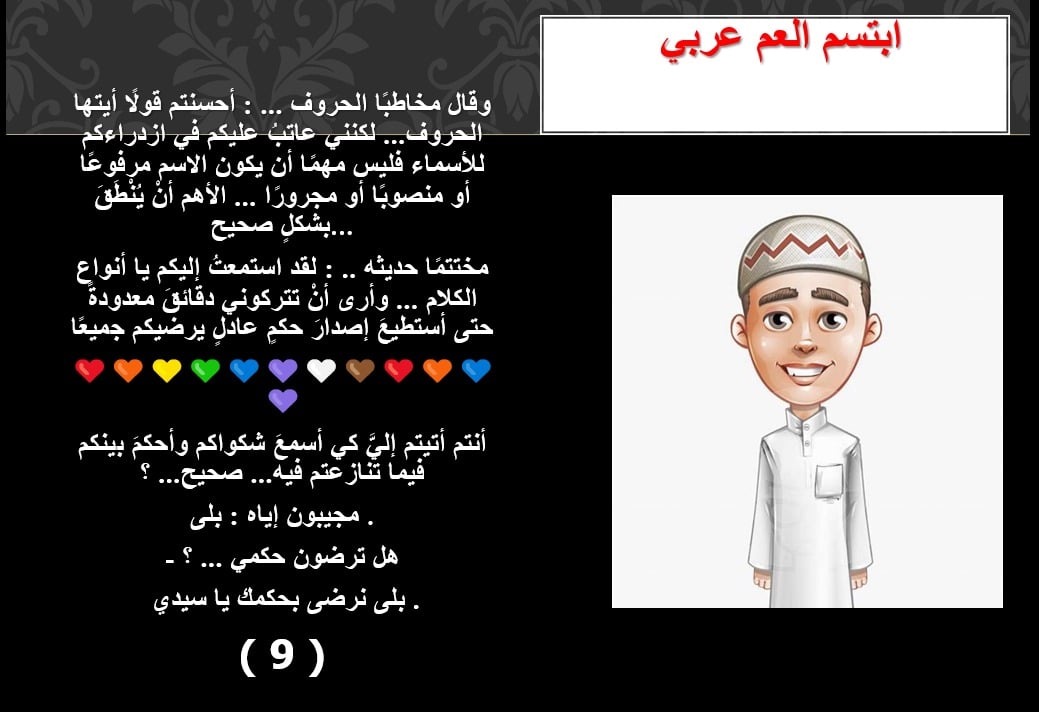 ابتسم العم عربي، وقال مخاطبا الحروف: أحسنتم قولا أيتها الحروف، لكنني عاتب عليكم في ازدرائكم للأسماء فليس مهما أن يكون الاسم مرفوعا أو منصوبا أو مجرورا، الأهم أن ينطق بشكل صحيح.