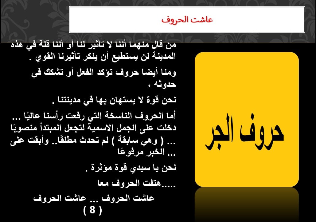 الحروف: الحروف لها عدة وظائف، فمنا من يشغل منصب حرف جر ومنا حروف العطف، ومنا حروف ناسخة، ومنا أدوات جازمة تنتمي إلينا، وأدوات ناصبة.