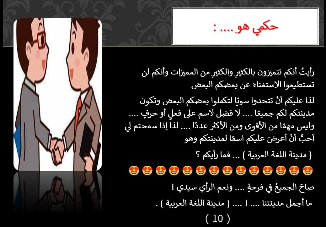 لذا عليكم أن تتحدوا سويًا لتكملوا بعضكم البعض وتكون مدينتكم لكم جميعًا، لا فضل لاسم على فعل أو حرف، وليس مهما مَنْ الأقوى ومَنْ الأكثر عددا، لذا إذا سمحتم لي أحب أن أعرض عليكم اسمًا لمدينتكم وهو: ( مدينة اللغة العربية )، فما رأيكم؟