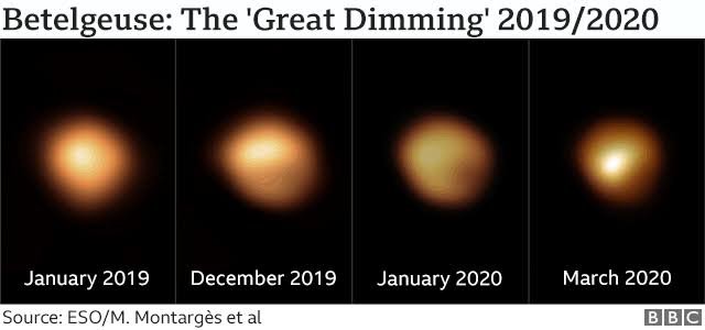 منكب الجوزاء هو أقرب مثال لعملاق أحمر وجد على بعد 642.5 سنة ضوئية ، في مجموعة أوريون النجمية في درب التبانة ، وتحديداً الكتف الشرقي لكوكبة الصياد ، ومن المتوقع أن ينفجر في مستعر أعظم في مايو 2022 ، إن لم يكن في وقت ما في مايو. المائة ألف سنة القادمة وهي نسبة ضئيلة جدًا مقارنة بمتوسط عمر النجم.