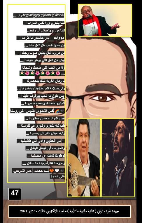 كلنا من أم واحدة أب واحد دم واحد بس حاسيين باغتراب تحت نفس الشمس وفوق نفس التراب كلنا بنجري ورا نفس السراب كلنا من أم واحدة أب واحد دم واحد بس حاسيين باغترااااااب…