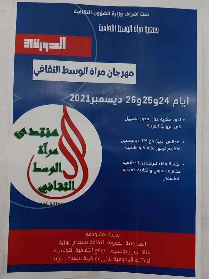 …بعد ان تم تأجيله مرارا وفي العديد من المناسبات بسبب تواصل جائحة” كورونا” وغياب الدعم المالي واللوجستي نجحت مؤخرا هيئة جمعية النهوض بمجلة مرٱة الوسط بالتعاون مع المندوبية الجهوية بسيدي بوزيد بتنظيم مهرجان مرٱة الوسط الثقافي في دورته ال31 وذلك أيام 24-25 و26 ديسمبر الماضي بفضاء المكتبة العمومية بسيدي بوزيد… وكالعادة تصنع مرٱة الوسط الحدث وتوزع أكاليل الفرح هنا وهناك علي أسوار مدينة سيدي بوزيد الأبية أين هندس لها كالعادة الدكتور الإعلامي زميلنا محمود الحرشاني والذي رسم لوحة فسيفسائية جميلة جمعت بين الأدب والشعر والنقد والتكريم .هذا وكان دور جمعية النهوض بمجلة مرٱة الوسط فعالا بالتعاون مع المندوبية الجهوية للثقافة بسيدي بوزيد وإدارة المكتبة العمومية التي شهدت تساقط حبات الإبداع والإمتاع والإقناع علي مسرحها وبعد البدايات والترحيب بالجميع والذين هبوا من كل المدن التونسية للاحتفاء بمرٱة الوسط في عرسها ال31 هذا ولقد كانت الانطلاقة بندوة فكرية بعنوان” التخييل في الرواية العربية الحديثة” بمشاركة الدكتور إسماعيل الشعيبي والروائي عباس سليمان والدكتور وليد الزواري ثم كان الحضور علي موعد مع الروائي عباس سليمان والذي تحدث عن كتابات الروائية زهرة الظاهري إلى جانب محاضرة الأستاذ إسماعيل شعيبي لطلبة سبيطلة والحضور كما قدمت الروائية أميرة مبارك مولودها البكر رواية” لعنة جزر بالميرا”… إلى جانب مشاركة المونوجوليست الفنان عبد الواحد زاوية والذي قدم العديد من السكاتشات الطريفة ثم جاء دور تكريم الراحلتين الإعلامية الزميلة حذامي عيساوي بحضور شقيقتها تماضر عيساوي والأديبة حفيظة قاسمي إلى جانب الإعلامي الراحل صالح القادري … وتباعا تساقطت حبات الشعر هنا وهناك من إبداعات عبد السلام شعيبي، كريمة حسني، إيمان الفالح، عبد اللطيف العمري، بلقيس قاسمي وهكذا أسدل الستار علي الباقة ال31 لمهرجان مرٱة الوسط الثقافي بتكريم كل الحضور من مبدعين وكتاب وشعراء وإعلاميين ومدونين بانتظار قادم الدورات في قادم السنوات..