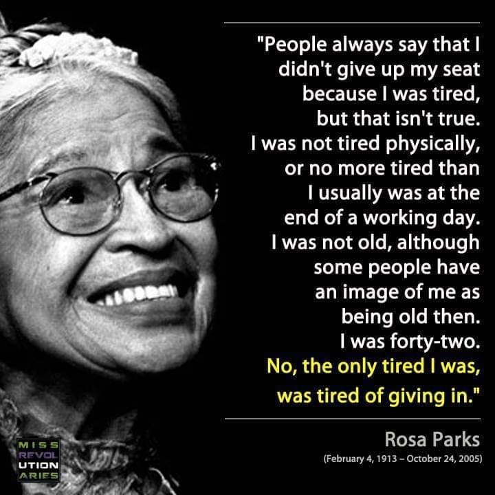 2- روزا باركس – أميركية من أصول أفريقية (1913 – 2005) وهي ناشطة طالبت بالحقوق المدنية للأميركيين الأفارقة، واشتهرت عندما رفضت التخلي عن مقعدها في باص عمومي لشخص أبيض، عاصية بذلك أوامر سائق الباص في الستينيات.