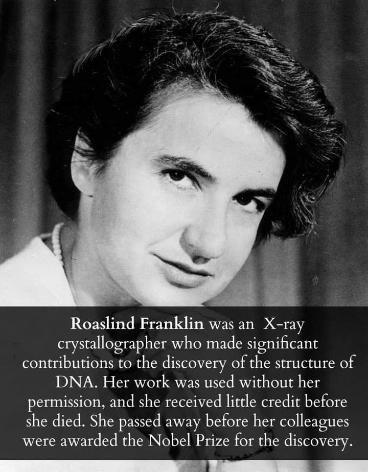 5- روزاليند فرانكلين (1920 -1958)، عالمة فيزياء حيوية بريطانية المولد، وخبيرة بالتصوير الإشعاعي، حيث كان لها دور مهم في فهم تركيب وشكل الـ DNA والفيروسات والفحم والجرافيت.
