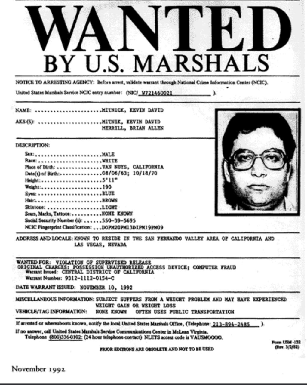 وتم رصده وهو يجوب فضاء الإنترنت يتلاعب بشركات الهاتف، ويسرق ملفات من موتورولا وأبل، وشركات أخرى، وينسخ عشرين ألف رقم بطاقة ائتمان من إحدى شبكات الكمبيوتر التجارية. ودارت الشبهة في كل هذه الحالات حول كيفين ميتنيك، المختفي عن الأنظار منذ عام 1992 وكشفت أنه يقوم بعملياته عبر شبكة هواتف متحركة من مدينة رالي شمال كاليفورنيا.