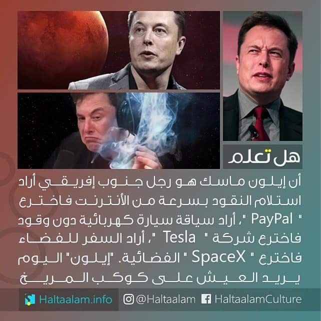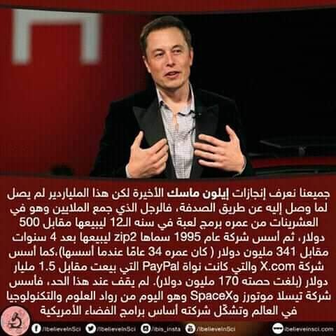 إيلون ماسك (28 يونيو 1971 -) (بالإنجليزية: Elon Musk) رجل أعمال كندي، حاصل على الجنسية الأمريكية ولد في جنوب أفريقيا، مستثمر مهندس ومخترع. مؤسس شركة سبيس إكس ورئيسها التنفيذي، والمصمم الأول فيها. المؤسس المساعد لمصانع تيسلا موتورز ومديرها التنفيذي والمهندس المنتج فيها. كما شارك بتأسيس شركة التداول النقدي الشهيرة باي بال، ورئيس مجلس إدارة شركة سولار سيتي. يطمح ماسك إلى تجسيد فكرة نظام النقل فائق السرعة المسمى بالهايبرلوب.
