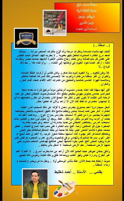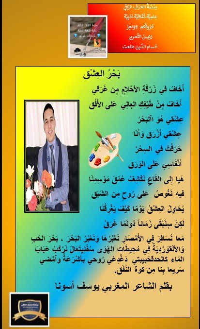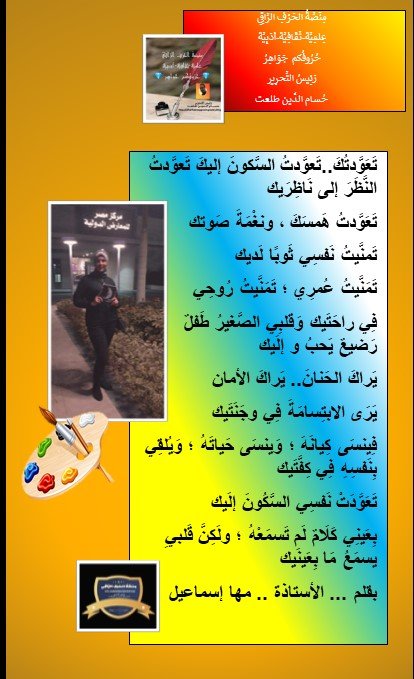 أشتاق سلامًا ... يعانق كفينا .... أشتاقُ نهارًا ... تسطع شمسه ... في عينيكِ ... أشتاق طريقًا ... تجمعنا ... خطواته ... أشتاقُكِ سكنًا ... تأوي إليه الروحُ ... أبدا ... 💜💛💙💖💚 حسام الدين طلعت عرض مقالات أكثر