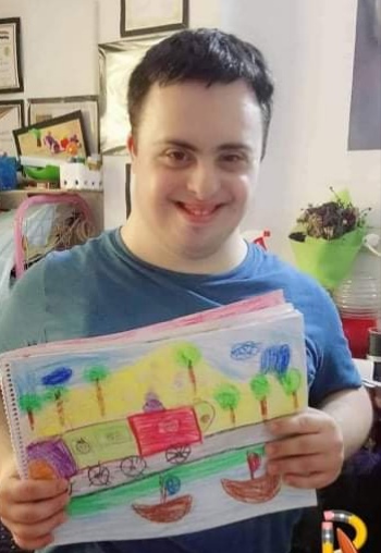 يزن وائل ديوب يافع من جبلة سورية، ولد يزن بمتلازمة داون وكثيرا ما يصاب الأهل بالإحباط عند ولادة طفل من ذوي الاحتياجات الخاصة، وهنا تكون المسؤولية على الأم كبيرة، وكبيرة جداً، والدة يزن الكاتبة سامية إسبر، عاشت مع يزن هذه التجربة والآن يزن يافع، يافع وموهوب بالرسم يمارس هوايته طوال الوقت، لوحاته جميلة جدا، كجمال يزن ومبهجة، كالبهجة التي يزرعها يزن في نفس من حوله، يعاني يزن من صعوبة في النطق، لكن لديه موهبة كبيرة بتكلم لغة يفهمها الجميع هي لغة الفن.