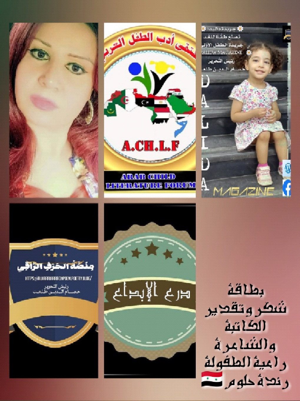 تتقدم جريدة داليدا الإلكترونية تحت مظلة منصة الحرف الراقي بجزيل الشكر والإعزاز والتقدير للكاتبة والشاعرة وراعية الطفولة..
