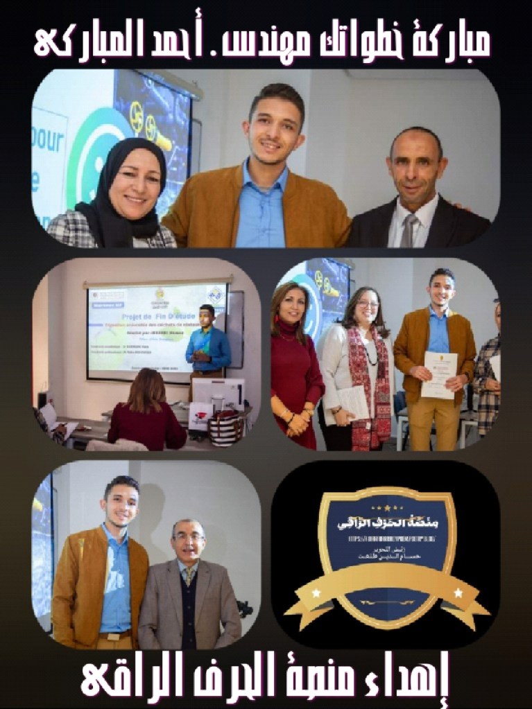 اليوم بعد الزوال وفي فضاء أحد مخابر الجامعة المركزية بتونس العاصمة ناقش الشاب النبيه، ابن حاجب العيون وأحد أعضاء فضائنا هذا رسالة التخرج اختصاص بيولوجيا أمام لجنة الامتحان وبحضور أسرته وأصدقائه؛ حيث قدم أحمد المباركي ملخصا باهرا ومميزا لبحثه العلمي قبل أن يتفرغ للتحاور مع رئيسة اللجنة والأستاذة الممتحنة والأستاذة المؤطرة ليتم منحه شهادة مهندس اختصاص بيولوجيا بملاحظة حسن جدا، ويختم على سنوات تعليمه العالي كأروع ما يكون ويرد الجميل لأبويه ولمدينته الصغيرة، برافو باش مهندس والعاقبة لمستقبل مشرق وضاء.