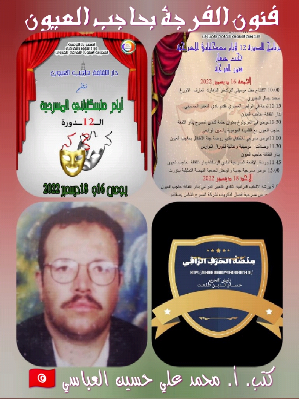 ستنظم دار الثقافة (علي الزواوي) بحاجب العيون فعاليات الدورة الثانية عشرة لأيام ماسكيلياني المسرحية يومي16 و18 ديسمبر الجاري تحت شعار” فنون الفرجة” أين ستعمل هيئة دار الثقافة بإدارة الأستاذة: اسمهان العباسي بالتعاون مع المندوبية الجهوية للثقافة بالقيروان علي إنجاحها والاحتفاء بالفن الرابع عبر التنويع في برنامج الدورة من عروض مسرحية، ومراوحات فنية، ورقص حسب البرنامج التالي: - الجمعة: 16-12-2022