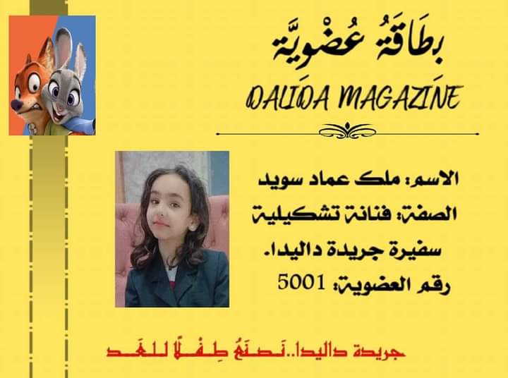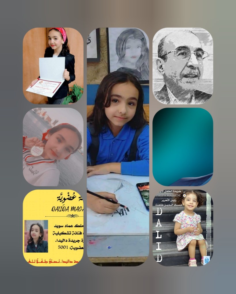 ملك عماد سويد زهرة فاح أريجها بين خمائل وجداول روضة جريدة ” داليدا ” للطّفل وهي رغم صغرها حبّة من عنقود الزّمرد والياقوت، قد أثمر في مدرسة مصر المجد والتّاريخ والإشعاع الفكري أين يرضع الصّغار رحيق الكلمة مع لبن الأمومة وقد تعطّروا بندى نهر النّيل العظيم وهو يرتسم عنوانا للملاحم والأساطير والقصص والأناشيد واللّوحات التشكيليّة، وهي كذلك صديقة الجميع لقاء مواهبها المتعدّدة وأخلاقها النّبيلة.