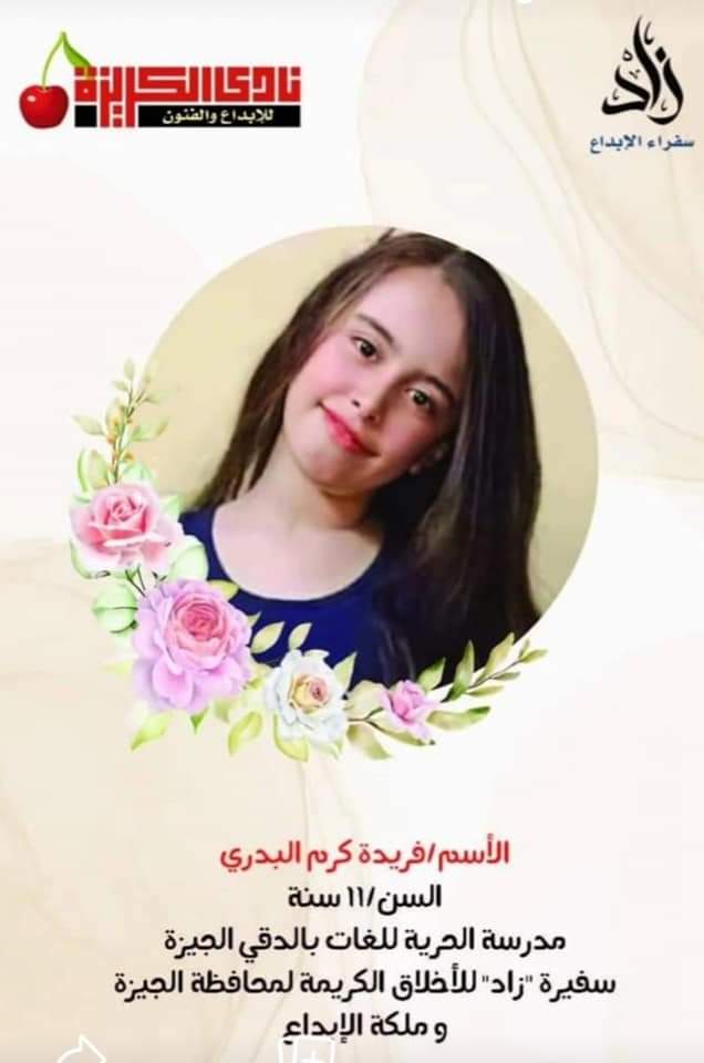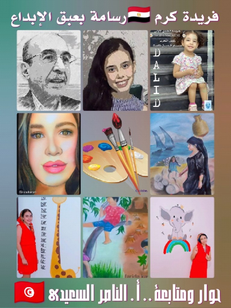 فريدة كرم: 11 سنة، تلميذة بالصف السّادس ابتدائي بمدرسة الحريّة القوميّة للّغات، سليلة مصر المجد والتّاريخ وابنة الجيزة مدينة ضاربة في الحضارات الإنسانيّة بشهرتها التّاريخيّة الباهرة قديماوحاضرا، هي مهووسة بالفنّ التشكيلي الذي جعل منها بطلة مشهورة بين أهلها وخلاّنها وأساتذتها لقاء تميّزها في مثل هذا الفنّ الجميل قولا وفعلا، دعونا فريدة كرم إلى استضافة شيّقة وتحادثنا معها فكان الحوار التّالي: