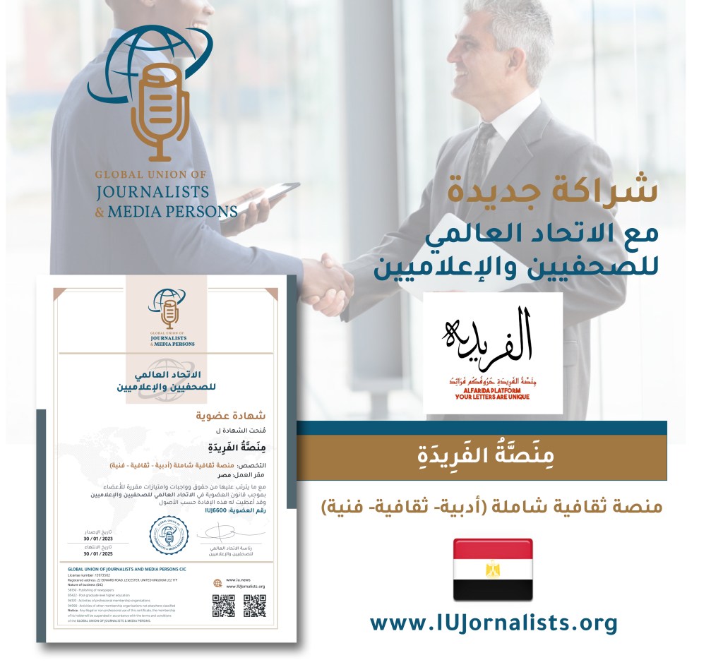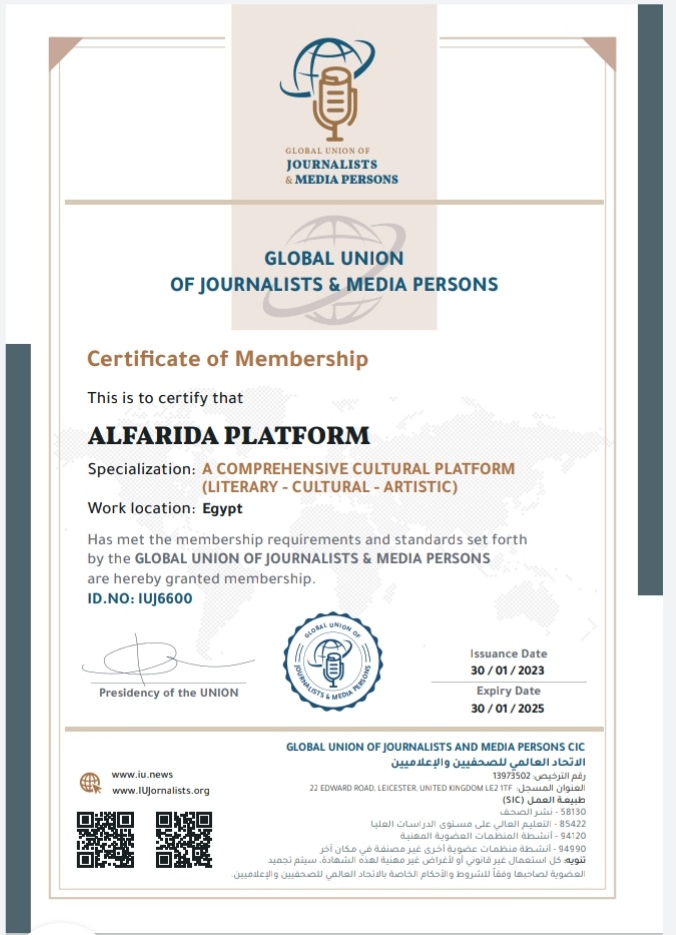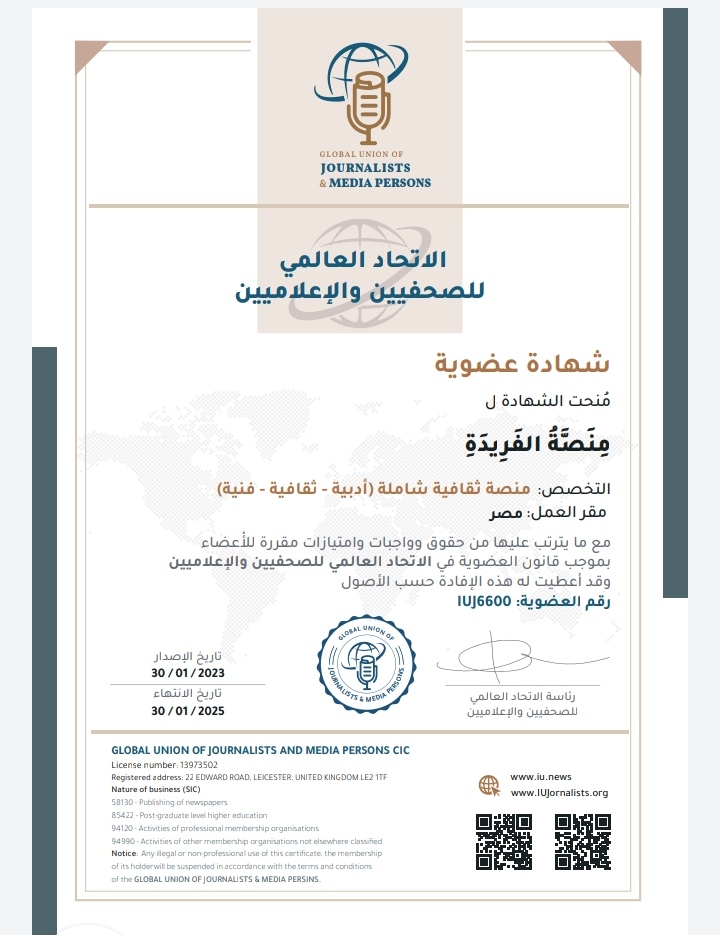 تَمَّ بحَمدِ الله وفَضلِهِ منح مِنَصَّةِ الـفَـرِيــدَة شَـهَــادة عُــضـوِيَّـة تـابـعـة للاتــحــاد الــعــالــمــيِّ للصحـفـيـيـن والإعـلامـيـيـن كَمِــنَـصَّـة ثَـقَــافِــيَّــةٍ شَــامِـلَــةٍ، وَهَــذَا فَــضْــلٌ وَمِــنَّــةٌ مِن الــرَّحــمـٰـن.