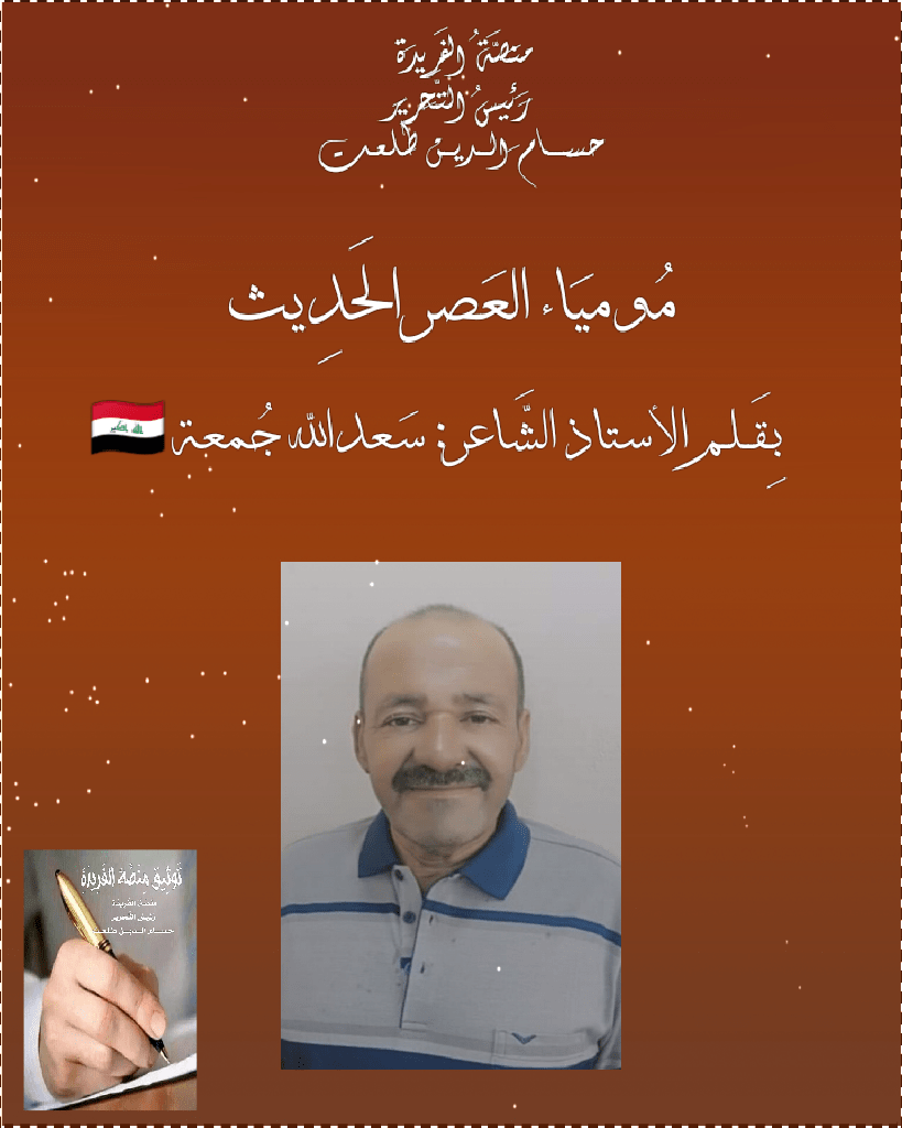 💎 مِنَصَّةُ الفَرِيدَةِ 💎حُرُوفُكُم فَرَائِدُرَئِيسُ التَّحرِيرحـســــام الـــديـــن طـلـعــتhttps://alharfuarraqypoem.poetry.blog/……………………………………………………………… مومياء العصر الحديثبِـقَــلـم الأستاذ: الشَّاعر سَعدالله جُمعة 🇮🇶………………………………. عندماتتراكم الحكاياتعلى أطراف الليليطول السهرعلى متصفح مغلقبشمع الأسرارنبكي نتوارى خلف ظلال العيوننركب موج الوحشةنتحاور بلهفة الشوقنضيع في منحدر أحلاممقطوعة الأنفاستتكدس فوق طرقمليئة بالأشواكأسير بصمتأحمل في جعبتي الألمتنزف الأقدام المتقرحةمن حرارة الأحزانيرافقني ظلي الكسيحنقرأ لافتات الطرق البعيدةنتسامر مع الأشباحفي سكونمتابعة قراءة “مومياء العصر الحديث، بِـقَــلـم الأستاذ: الشَّاعر سَعدالله جُمعة 🇮🇶 🇪🇬 مِنَصَّةُ الفَرِيدَةِ رَئِيسُ التَّحرِير حـســــام الـــديـــن طـلـعــت”