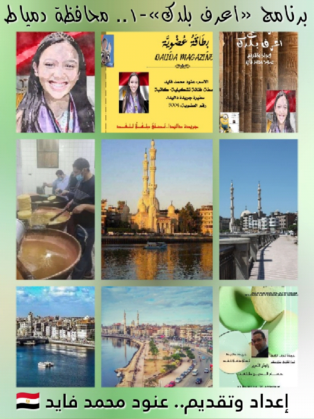 برنامج «اعرف بلدك»إعداد وتقديم: عنود محمد فايد………………………………….ماذا تعرف عن دمياط ؟؟مدينة دمياط عاصمة محافظة دمياط بأقصى شمال مصر، وبعدها بـ15كم يصب فرع دمياط من النيل في البحر الأبيض المتوسط عند رأس البر. يفصلها شريط ضيق عن بحيرة المنزلة، وإلى الجنوب الغربي تمتد مزارع وجه بحري (دلتا النيل) وسهولها.وهي من أجمل مدن مصر حيث تتميز بسواحلهامتابعة قراءة “العدد الجديد.. يناير 2023 DALIDA MAGAZINE.. برنامج «اعرف بلدك» -١.. إعداد وتقديم: الكاتبة. عنود محمد فايد 🇪🇬.. رئيس التحرير: الأستاذ. حسام الدين طلعت.”