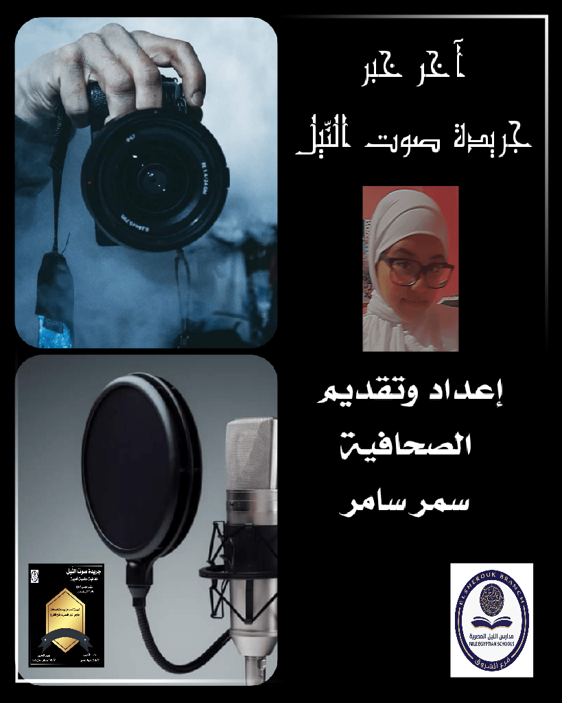 برنامج… آخر خبرإعداد وتقديمالصحافية/ سمر محمد سامرصحافة صوت النِّيل……………… جريدة صوت النِّيل الصادرة عن مدارس النيل المصرية فرع الشروق… رئيس مجلس الإدارة.. الأستاذة: وفاء محمد.. مدير التحرير.. الأستاذ: أشرف شعبان.. رئيس التحرير.. الأستاذ: حسام الدين طلعت..