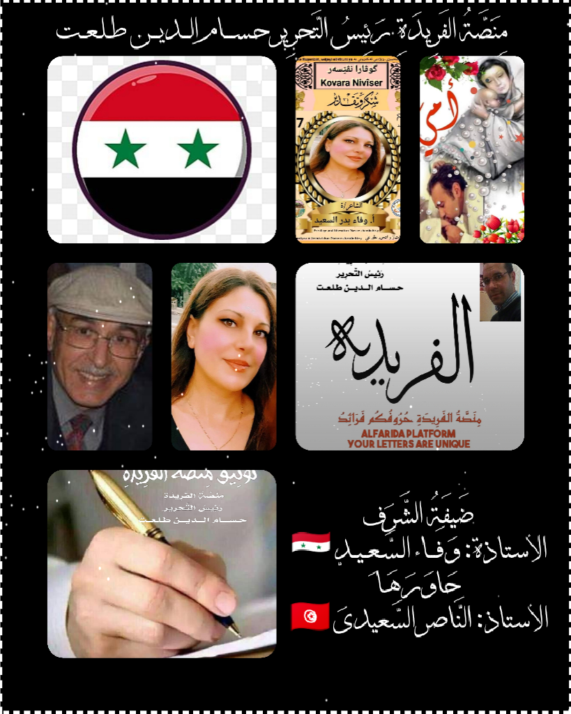 ورقة أدبيّة، ضيفة الشّرف: الأستاذة: وَفَـــاء الـسَّـعِــيــد من سوريا 🇸🇾حاورها: الأستاذ: النَّاصر السَّعيديِّ 🇹🇳 مِنَصَّةُ الفَرِيدَةِ رَئِيسُ التَّحرِير حـســــام الـــديـــن طـلـعــت