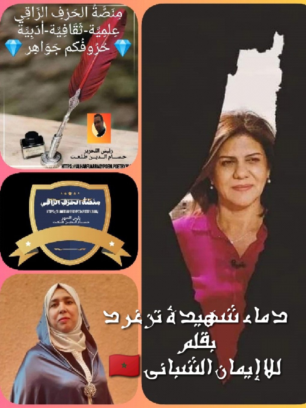🖋️🖋️دماء شهيدة تزغردبقلم .. الأديبة .. للا إيمان الشباني-المغرب 🇲🇦💎 مِنَصًَةُ الحَرْفِ الرَّاقِي💎رئيس التحرير ..الأستاذ .. حسام الدين طلعت🖋️🖋️تكريما لروحك الطاهرةشيرين أبو عاقلةعيون الحقيقة زمنابين ابتسامة انتصارعززت ابتسامة إصرار………..لا للعدو لا لنزع الكرامةعربية عنوان الشهامةمن جذور جود الزيتونعيون تحدثت صدقاأنا العربية الفلسطينيةلا أهاب الرصاص ….لا يفزعني دوي القذائفلا ترعبني الدماء .للشهادة أسعى ..بين عيون الحقيقةوسطمتابعة قراءة “دماء شهيدة تزغرد.. بقلم الأديبة.. للا إيمان الشباني.. المغرب 🇲🇦.. 💎 مِنَصًَةُ الحَرْفِ الرَّاقِي💎.. رئيس التحرير .. الأستاذ.. حسام الدين طلعت.”