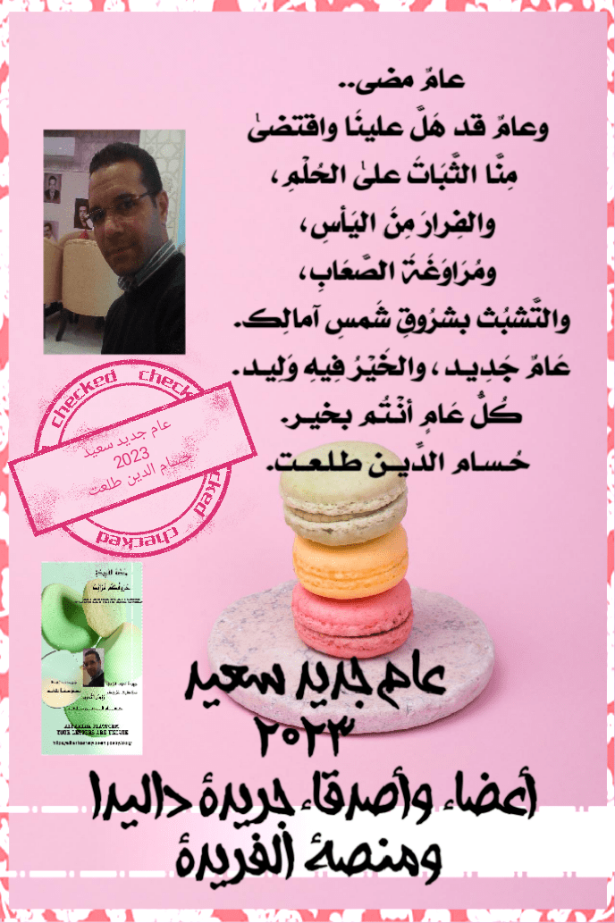 عَامٌ جَدِيـد، والخَيْرُ فِيهِ وَلِيـد.. يناير 2023 ميلادية.. بطاقة معايدة لأصدقاء وأعضاء مِنَصَّةِ الفَرِيدَةِ وجَرِيدةِ داليـدَا.. شُـكـرًا لـوجـودِ قُـلـوبِكم ❤❤❤❤ حـســــام الـدِّيـن طـلـعــت.