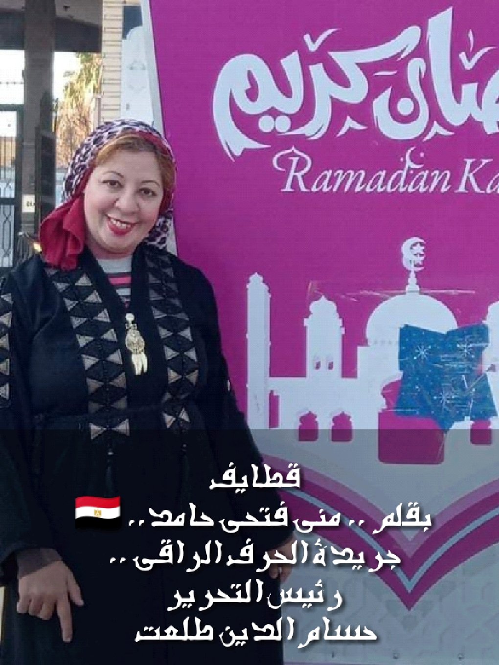 🖋️🖋️. قطايفمنى فتحي حامد-مصر 🇪🇬جريدة الحرف الراقي ..رئيس التحرير .. الأستاذ.. حسام الدين طلعت ..———-ما أجمل رمضانإحسانه بر و تقوىتراحم قلوب بين العتمة والنورملامحه واضحةخير و بركة بين نسمات الدناورود أريجها مغفرةصوم رمضان كل يوم فرحةفوانيس أضواؤها زاهيةبوجي و طمطم_في كل درامامشاعر سماؤها واضحةإنسان جميل_وسط الفوانيسضحكة أطفالناعلاء الدين من كنافة لقطايفمذاقهما حلوطبلة مسحراتي