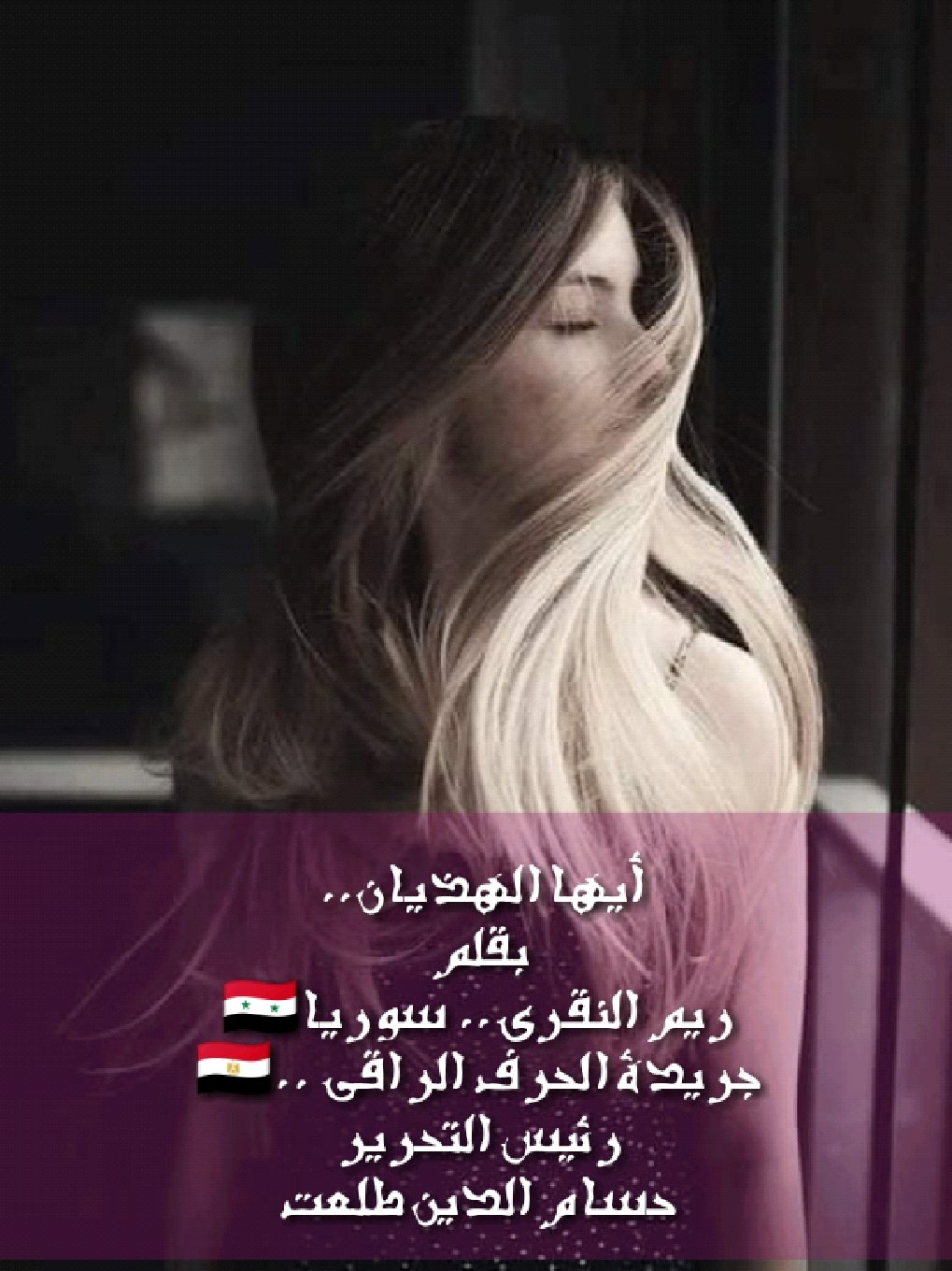 أَيًها الهذيانتعالَ نتوحّدنتشكّل كائناً واحداًهويّة نغرقُ فيهانعبر جغرافية هذا المكاننحلّق إلى اللا منتهىنستحمّ برذاذ قصيدة زمزميّةتستحق الحياة……..هات أناملكاعزفني لحنا بنكهة الفراغوغزارة طفولة شاردةتلونني ياقوت خيال………..رتّل على مسامعي بخشوعآيات تساجل سجاياي…………غرّدني قصيدةتزأر في مدايقربان موت /حياة…………ريم النقري.. سوريا 🇸🇾جريدة الحرف الراقي .. 🇪🇬رئيس التحرير .. الأستاذ . حسام الدين طلعت.