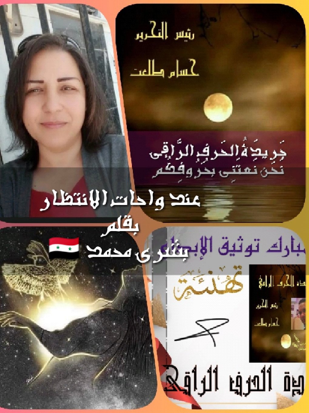 🖋️🖋️عند واحات الانتظارتباغتني قوافل الشوقتقتربوتقتربيفارقني الزمناختلي بنبضيألقنه ترانيم الوقتاهز النخلة فترمي أهاتوكلمات أجمعها وليمة لسهرة عشقكقوس قزح تعبر حنايا الروحأتوشح بألوانكاراقص كثبان وجدفيعانقني السرابويبدو الحلم أشبه بأسطورة🖋️🖋️بقلم .. الأستاذة .. بشرى محمد.. 🇸🇾جريدة الحرف الراقي . 🇪🇬رئيس التحرير ..الأستاذ .. حـسـام الـديـن طـلـعـت